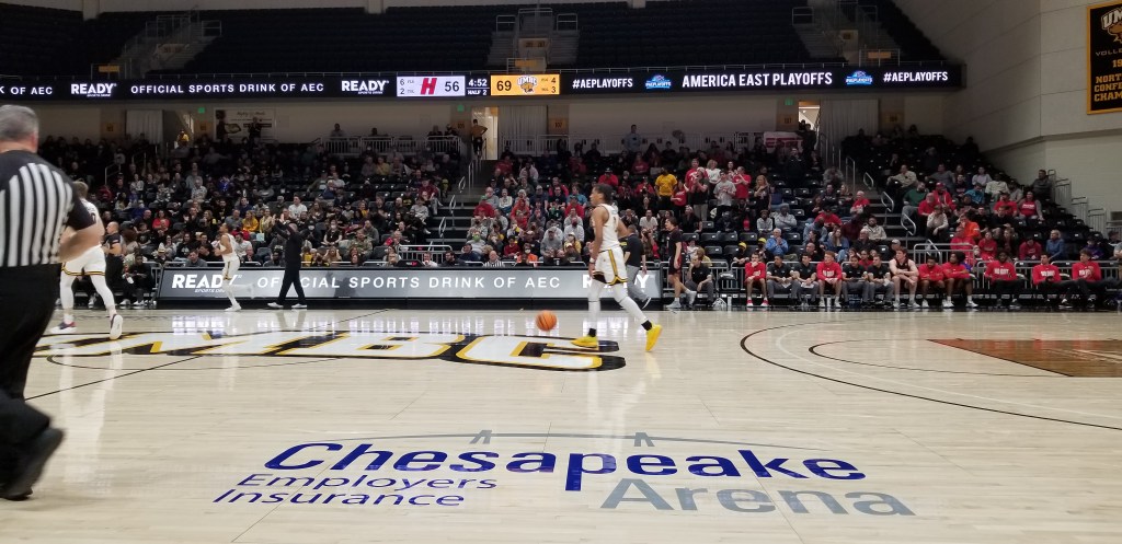 Keondre Kennedy and LJ Ownes hit timely threes for for UMBC to extend the retriever lead to seven at the 9:38 mark. The crowd at Chesapeake Employers Insurance Arena was behind their team all night. At the under eight media timeout UMBC extended the lead up to ten and John Gallagher was not happy with how things were going as he could be seen yelling at the refs.