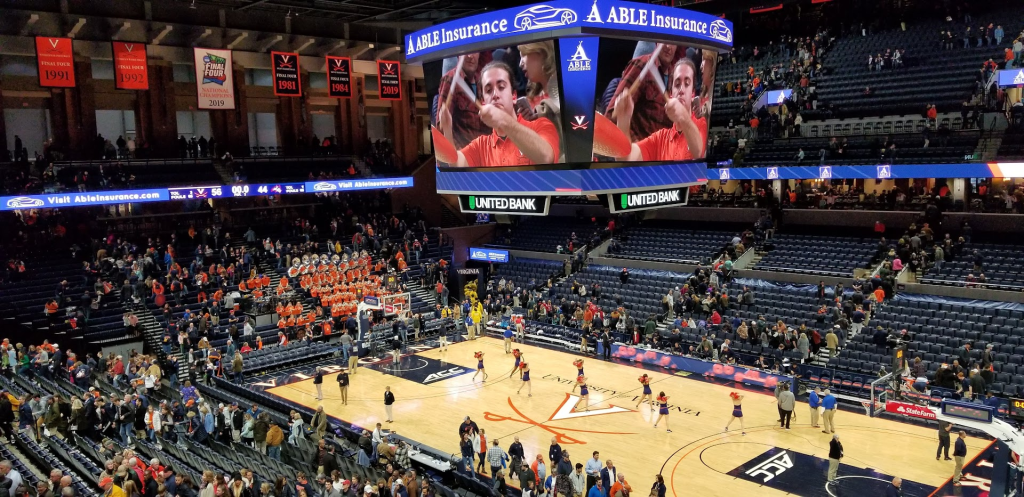 A couple of unique features about Virginia’s arena are the southern architecture style columns on the exterior of the building. On the inside there is a giant section of the 2019 final four court from the year that the Cavs won the national championship.