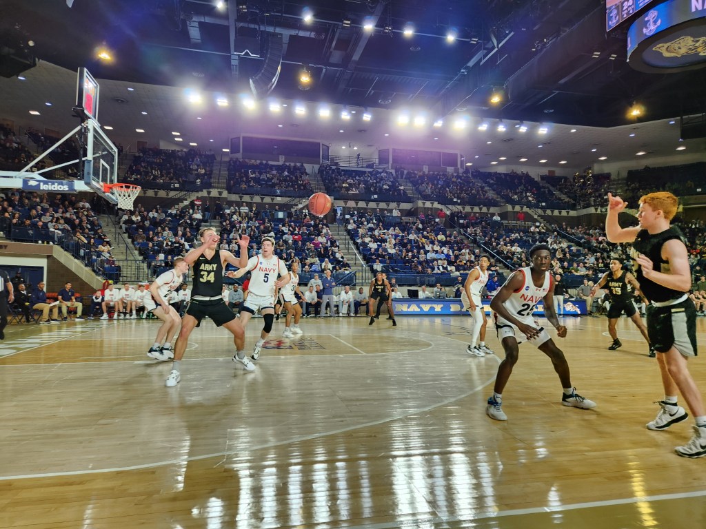 Army had a stretch of over four minutes of not scoring. Army had seven turnovers in the first fourteen minutes of the game. This was because of Navy’s great on ball defense that forced Army into bad passes, and the swarming paint defense of the Mids that tipped passes and forced jump balls. During this Army scoring drought Navy also capitalized offensively going on a 12-2 scoring run of their own.